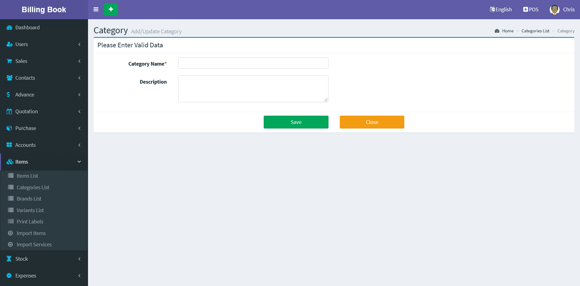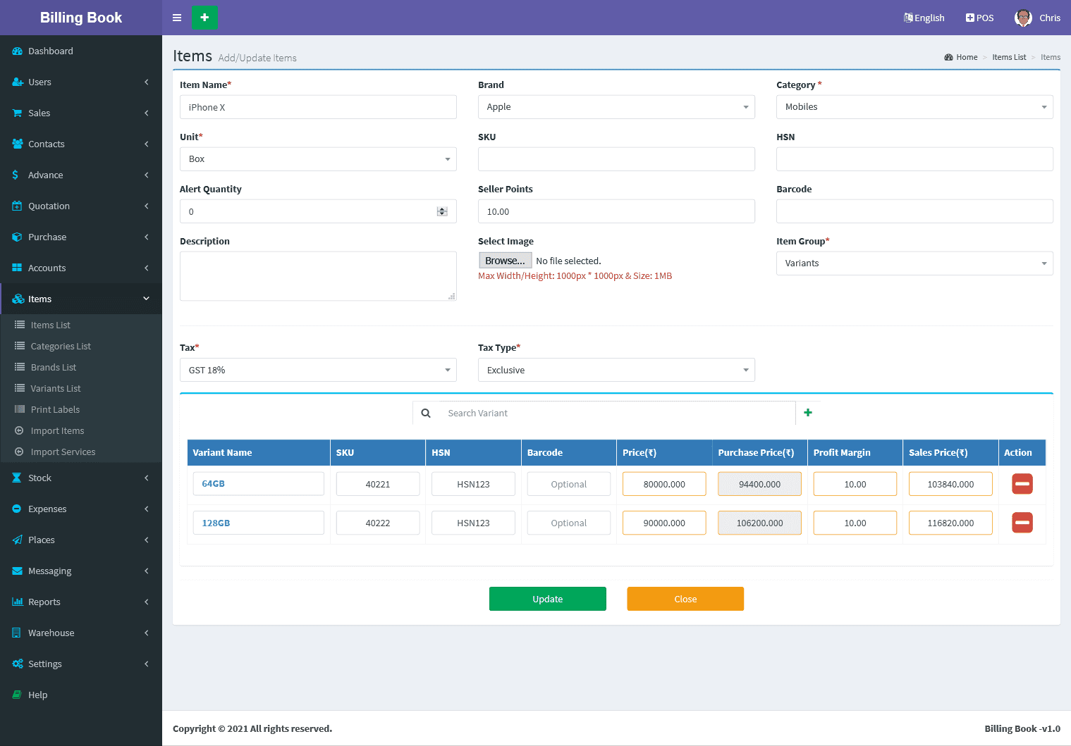 Adding a Items it's a very easy task. Enter Item name, Select Category, Unit, SKU(Optional Field), Alert Quantity(Optional field), Select Image(Optional field),Purchase Price(Without Tax), Select Tax, Tax Type(Inclusive / Exclusive), Profit Margin(in Percentage %) , Available/Current Stock(+/-) (Optional Field), Add Lot number(Optional), Expired Date(Optional) and click on Save button.