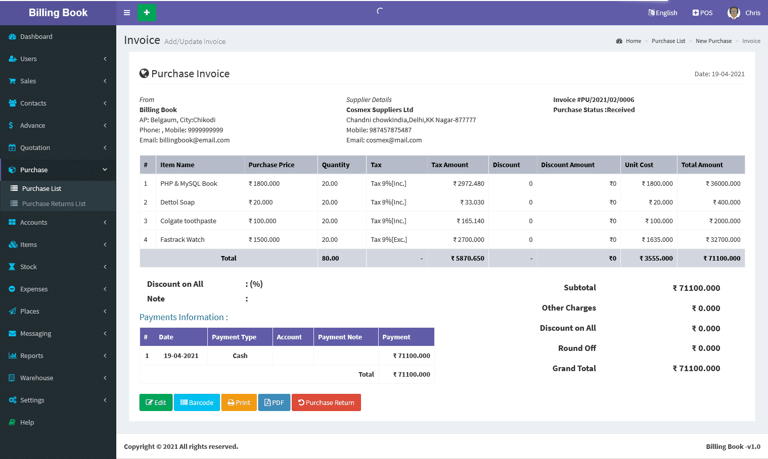Billing Book is a PHP based web application software, where user can track and manage Items & Stock, Suppliers, Customers, Items Categories, Sales Invoice, Purchase Invoice, users and get all the reports which are require to your office with many more features. You can create any number of Warehouses and Users.